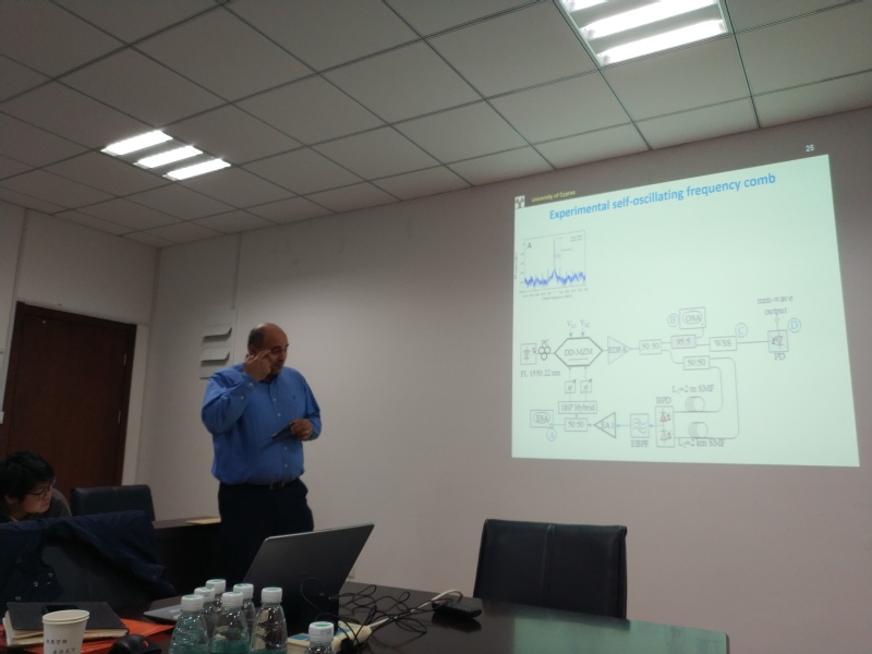 报告中,Stavros Iezekiel教授主要概述了微波光子学的优势和关键应用。重点介绍了基于自振荡光频梳的毫米波和THz信号的光子合成、光电振荡器驱动的光频梳、应用于光载无线中的集成微波光子学以及一些最近应用于电子战中的线性频率网络。报告持续了约两个小时,汇报期间,与会师生积极提问,与Stavros Iezekiel教授进行了充分的交流与讨论。报告结束后,Stavros Iezekiel教授参观了微波光子实验室,并与SPIE协会南京航空航天大学分会部分成员共同用餐,交流了最近的研究进展以及可能的合作方向。