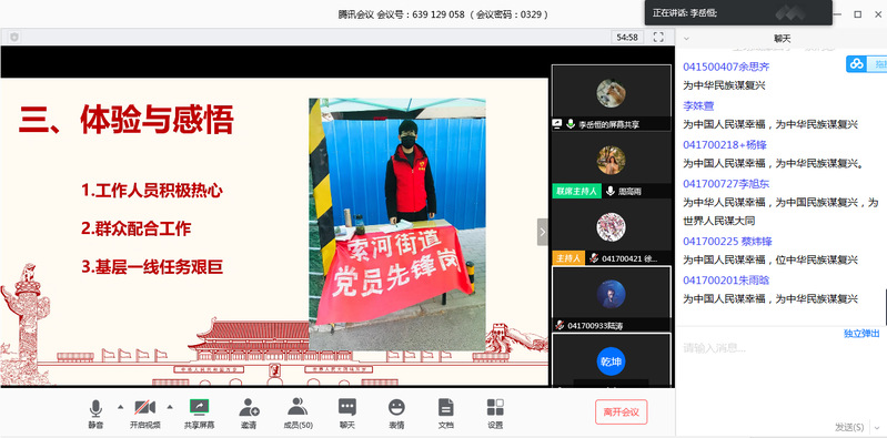 随后,支部成员李岳恒同学将自己在一线担任志愿者的经历进行分享。周高雨引用总书记给北京大学援鄂医疗队全体“90后”党员的回信,带领支部成员重温入党誓词,重问入党初心,鼓励大家勇担当、敢作为,多学习、多思考,充分发挥大学生党员的先锋模范作用,教育引导广大同学“自律、自护、自修”,努力学习,发奋成才。