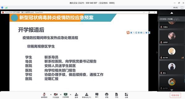 井岩峰同志围绕学校在疫情期间发布的三项通知——《关于严明新学期开学及“三节”期间疫情防控和纪律要求的通知》、《关于发布<新型肺炎疫情防控相关防控技术指南>的通知》、《关于发布<新型冠状病毒肺炎疫情防控应急预案>的通知》,具体阐述了学校在此次疫情防控期间的工作部署和有效措施,让支部党员体会到了全校师生心往一处想、劲往一处使,齐心合力抗击疫情的力量,他还倡导我们学生党员在疫情期间尽己可能发挥党员的带头作用,为抗击疫情尽一份绵薄之力。