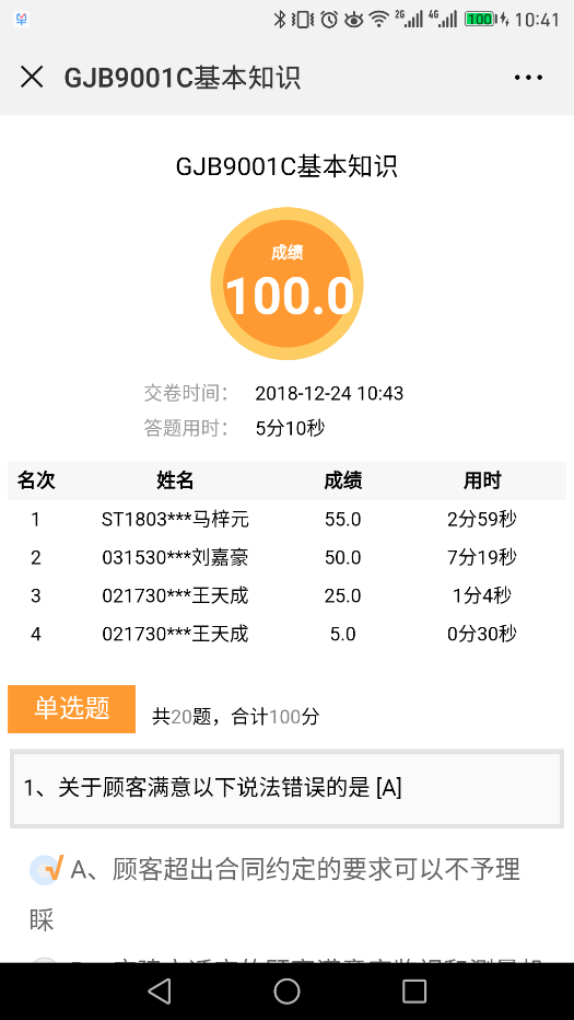 四、测试结束后,点击“交卷”,可查看得分及排名。