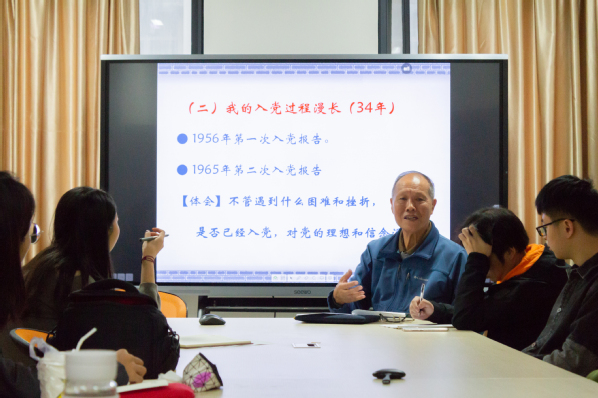 随后,戴明桢阐述自己作为一名“精神党员”,从1956年第一次递交入党申请书到1991年成功转正成为正式党员的曲折历程,并向同志们生动讲述了新中国初期我校的进步知识分子们筚路蓝缕建设社会主义新中国的艰难岁月。言毕,戴明桢真切地向同志们传达自己的革命信念:不管遇到什么困难与挫折,不管是否已经入党,对党的理想与信念,始终没有变。戴明桢继续从党章谈起,进一步阐释了努力做一名合格的共产党员的深刻内涵,并强调了“合格”的重点是“永远”,时刻严格要求自己,永远保“先”保质。