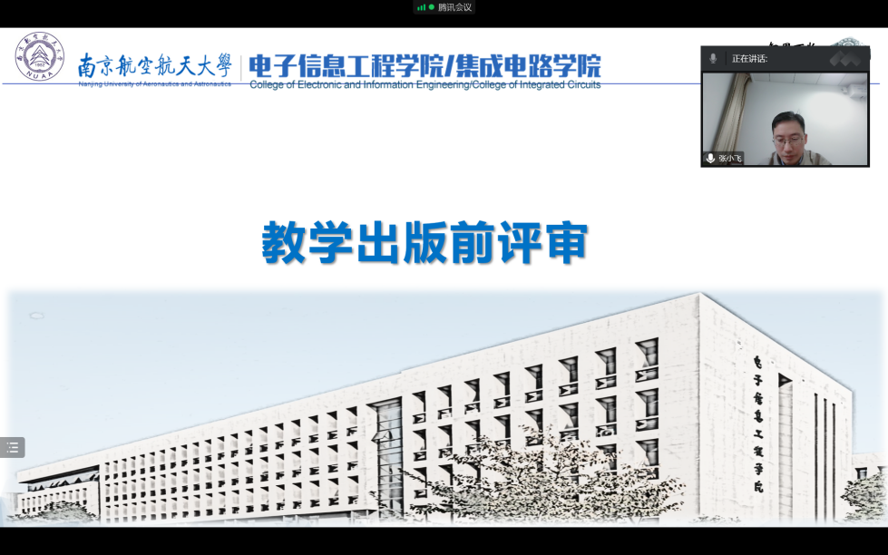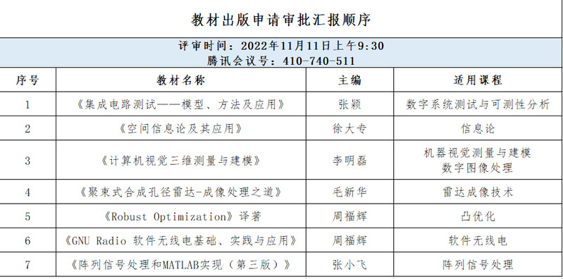 2022年11月11日上午,学院采用线上形式召开了2022年度教材出版前评审工作会议。会议邀请了东南大学副院长徐申教授、南京邮电大学教务处副处长李永涛、河海大学倪建军教授、南京航空航天大学赵永久教授和潘明海教授组成专家组。学院教授委员会主任徐大专教授、教材管理工作组成员及各教材主编参加了本次会议。会议由电子信息工程学院副院长张小飞教授主持。