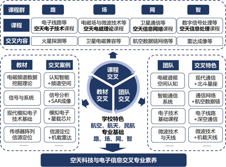 面向空天信息领域总师型领军型人才交叉专业知识结构需求,学院构建横跨产教之界的教师教学创新团队,引入空天电子信息交叉前沿最新成果,重构以“课程交叉、教材交叉、团队交叉”为特色的专业培养体系。