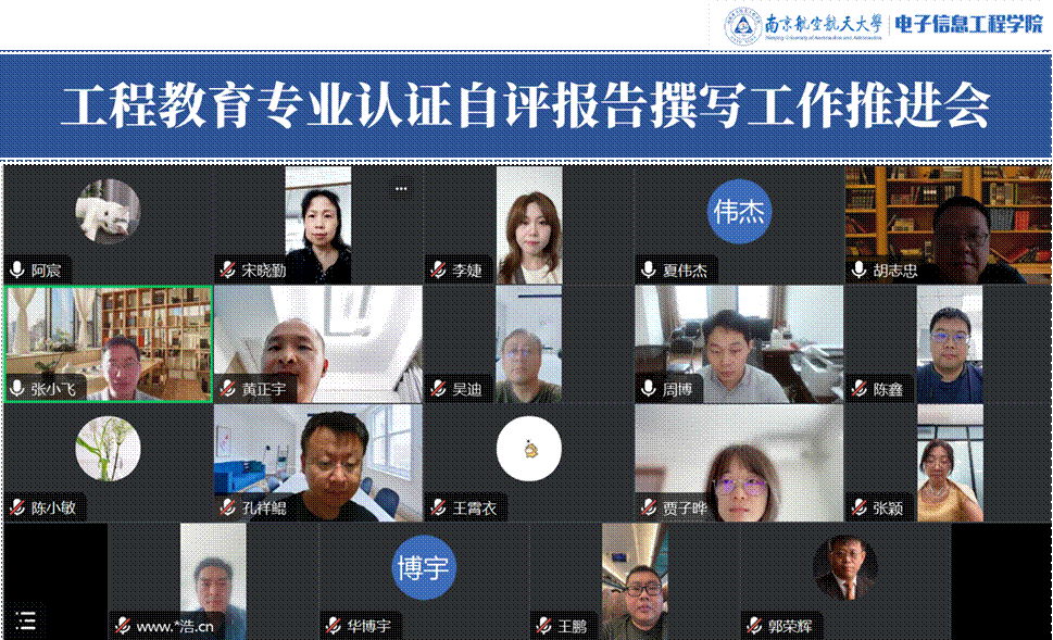 为了推进学院工程教育专业认证自评报告撰写工作、切实提高认证工作质量,7月19日,电子信息工程学院组织召开工程教育专业认证自评报告撰写工作推进会,副院长张小飞、院长助理夏伟杰,电子科学与技术系主任黄正宇,信息与通信工程系主任吴迪,电子信息科学与技术专业执行负责人胡志忠、信息工程专业执行负责人周博,各专业教师代表陈鑫、刘维浩、时晨光、孔祥鲲、张颖、郭荣辉、宋晓勤、陈小敏、王鹏、李婕、贾子晔、王霄衣、华博宇等参与本次研讨。会议由张小飞主持。