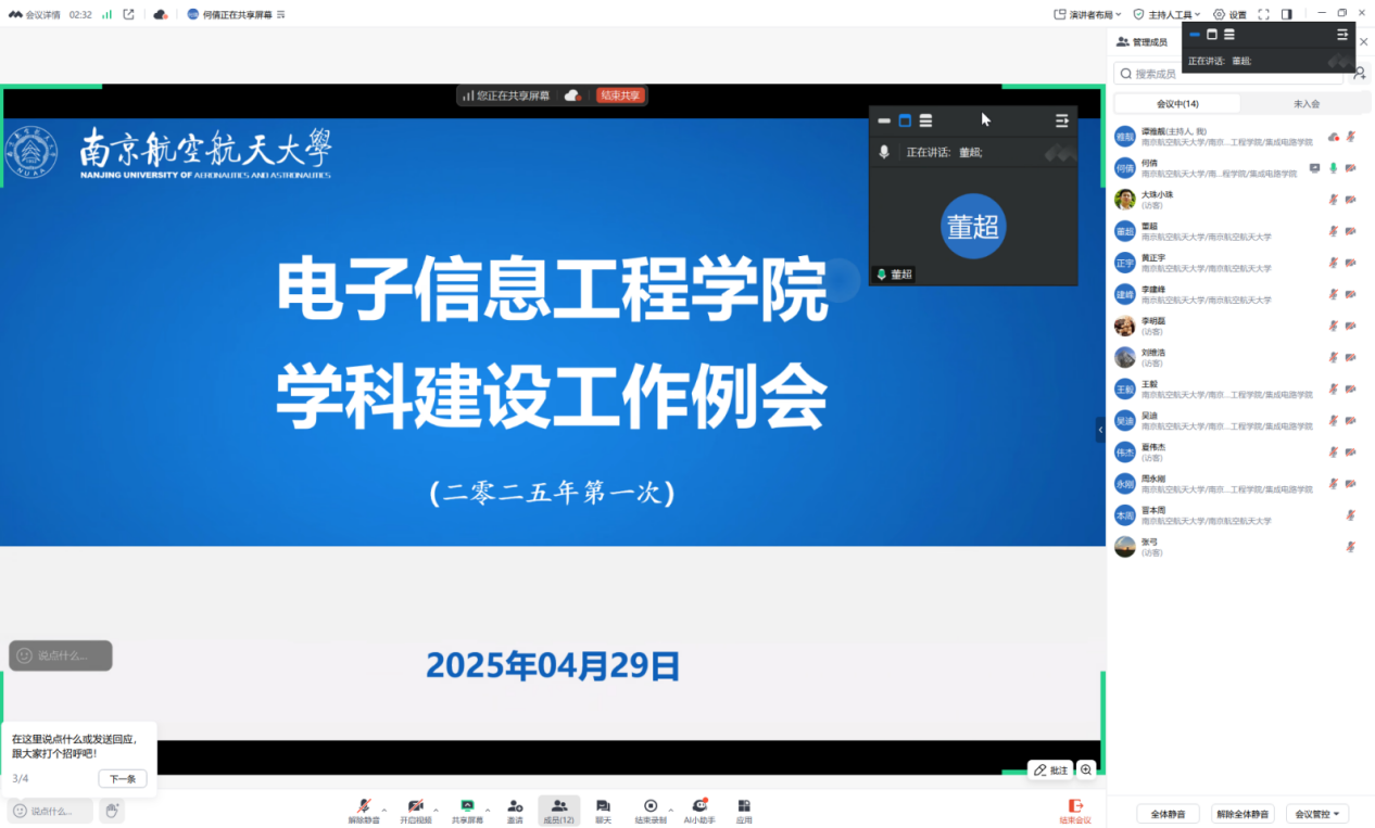 2025年4月29日,电子信息工程学院以线上形式召开2025年学科建设工作第一次例会,副院长董超主持会议,二岗教授代表朱岱寅、学科建设工作相关人员张弓、夏伟杰、周永刚、吴迪、黄正宇、晋本周、李明磊、李建峰、刘维浩、王毅及学科科研办何倩、谭雅靓参会。