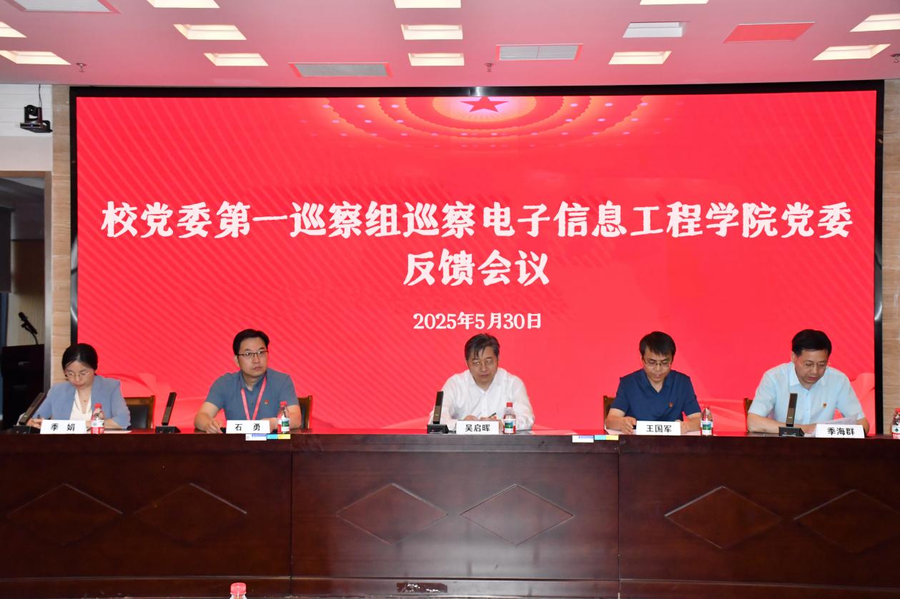 2025年5月30日,电子信息工程学院在学院515报告厅召开校党委第一巡察组巡察电子信息工程学院党委反馈会。校党委常委、副校长吴启晖,校纪委副书记、巡察办主任王国军,校党委第一巡察组组长石勇出席会议,学院全体教师及学生代表参加。会议由学院副院长季娟主持,旨在深入贯彻落实学校党委巡察工作部署,扎实推进巡察整改任务。