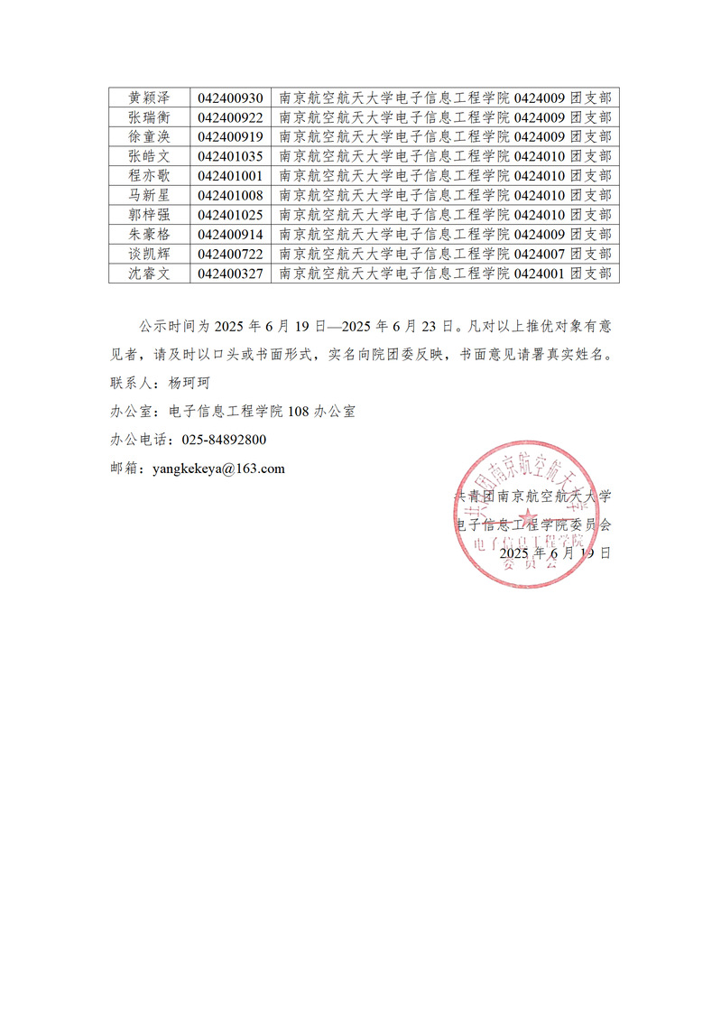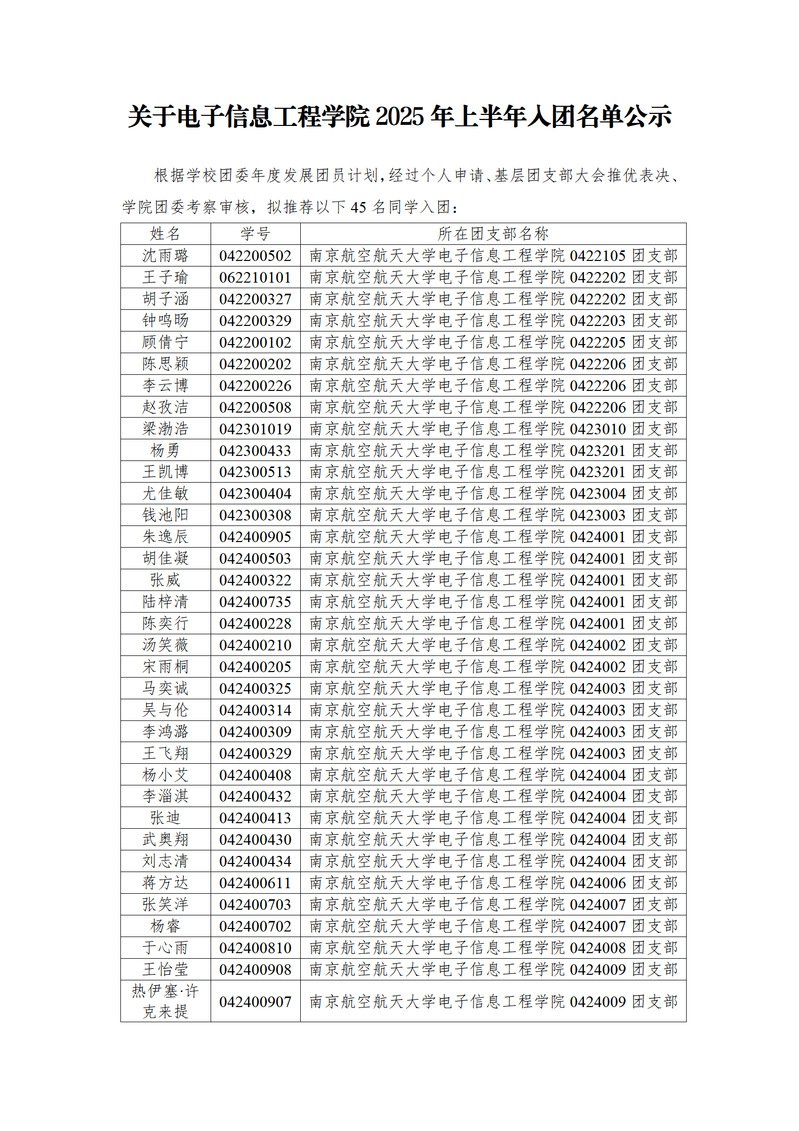 关于电子信息工程学院2025年上半年入团名单公示