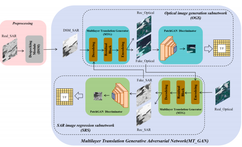 王鹏副教授指导博士研究生陈永康与朱岱寅教授、香港大学黄波教授以及法国格勒诺布尔理工学院Jocelyn Chanussot教授合作发表的论文“MT_GAN: A SAR-to-optical image translation method for cloud removal”被ISPRS接收,该论文结合了SAR能够穿透云层、降雨和雾以及光学图像包含丰富光谱信息的优势,针对SAR图像中的散斑噪声和光学图像在云层覆盖下往往难以观测的问题。提出一种基于多层翻译生成对抗网络(MT_GAN)的云去除方法。并且在4个数据集上进行实验,其中2个用于图像翻译实验,另外2个用于去云实验。结果表明,我们所提出的方法在无论是在客观评价指标层面还是主观可视化图像展示层面,都能达到优质的效果,并可以有效地去云。该方法的主干网络结构如下所示: